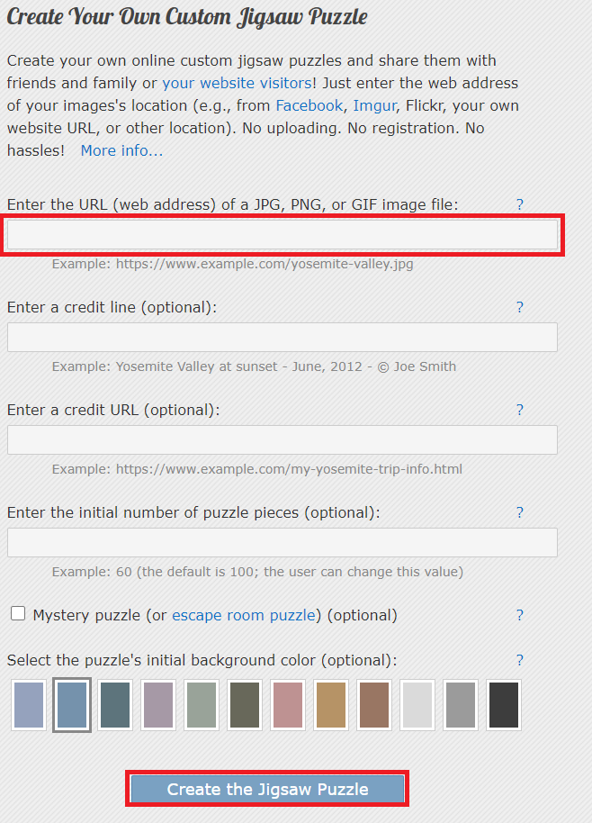 메인화면에서 Create a custom puzzle and share it or add it to your own website 를 눌러줍니다.