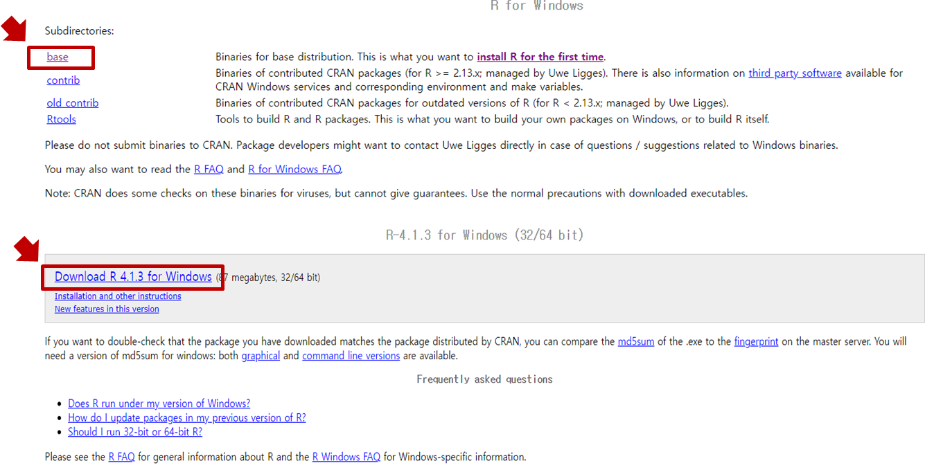 5. 화면 상단의 "base" 클릭 후 다음 화면에서 "Download R.4.1.3 for Windows" 클릭