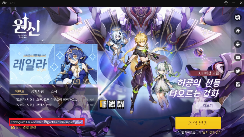 3) 모두 읽고 동의를 체크한 후 바로 설치를 누르면 빠르게 다음 단계로 넘어간다. 그러면 이제 원신 파일을 어디에 설치할 지 결정하면 된다.