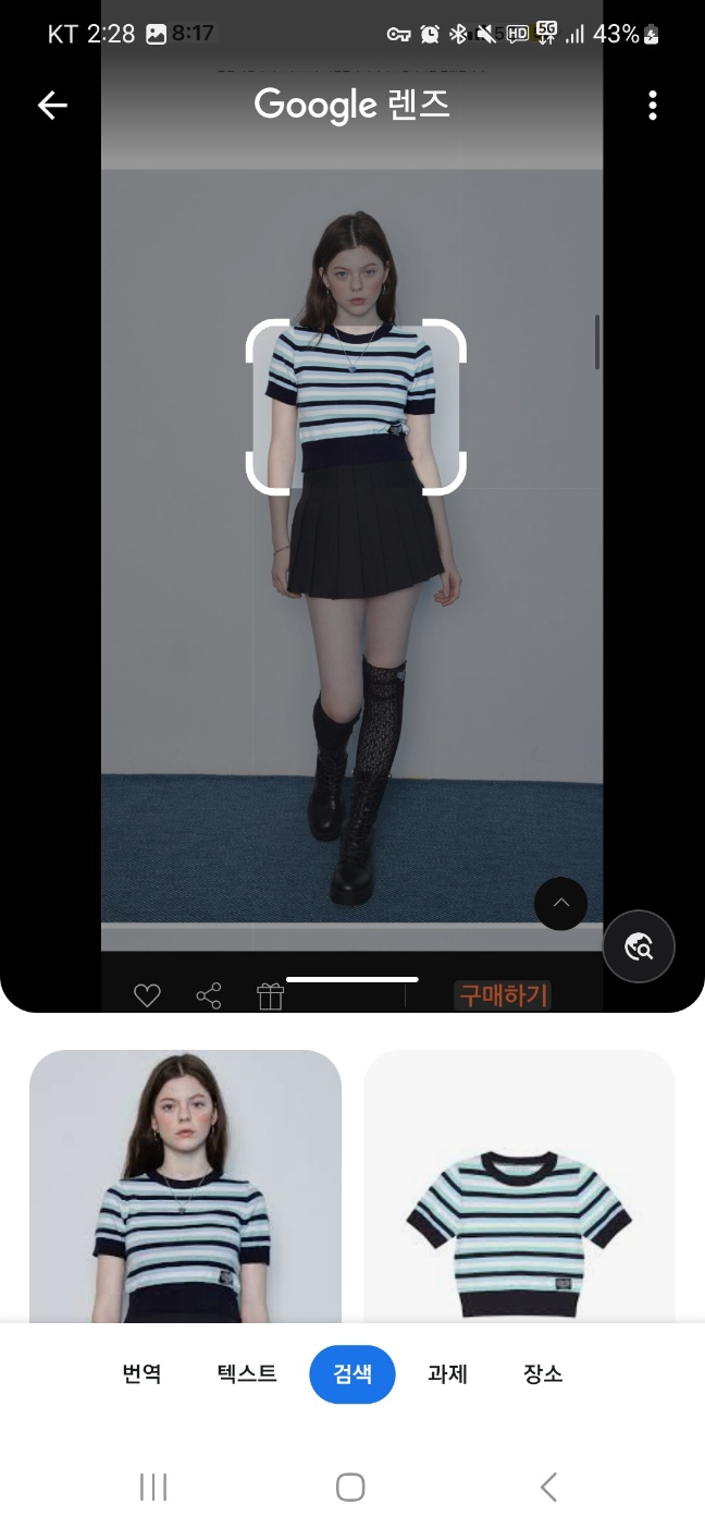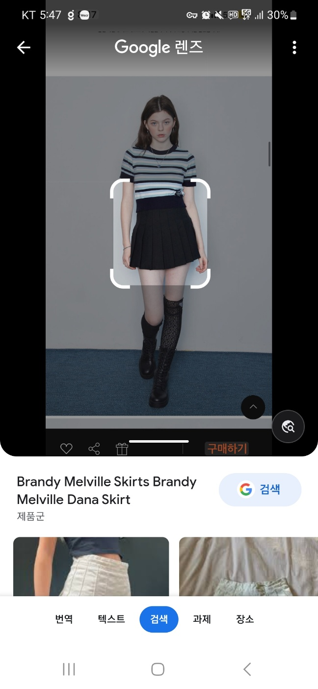 4. 사물뿐만 아니라 본인이 원하는 옷에 대한 정보도 Google 렌즈를 통해 검색하실 수 있습니다. 선택한 상자 주위의 모서리를 드래그하여 상품을 찾아줍니다. (상의, 하의, 양말, 신발, 액세서리 모두 가능합니다.)