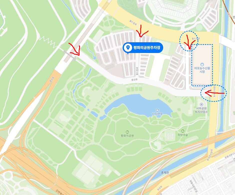 마포농수산물시장 주차장에 주차하고 평화의공원을 이용한 뒤, 장을 보고 무료 주차권을 받으시면 됩니다.