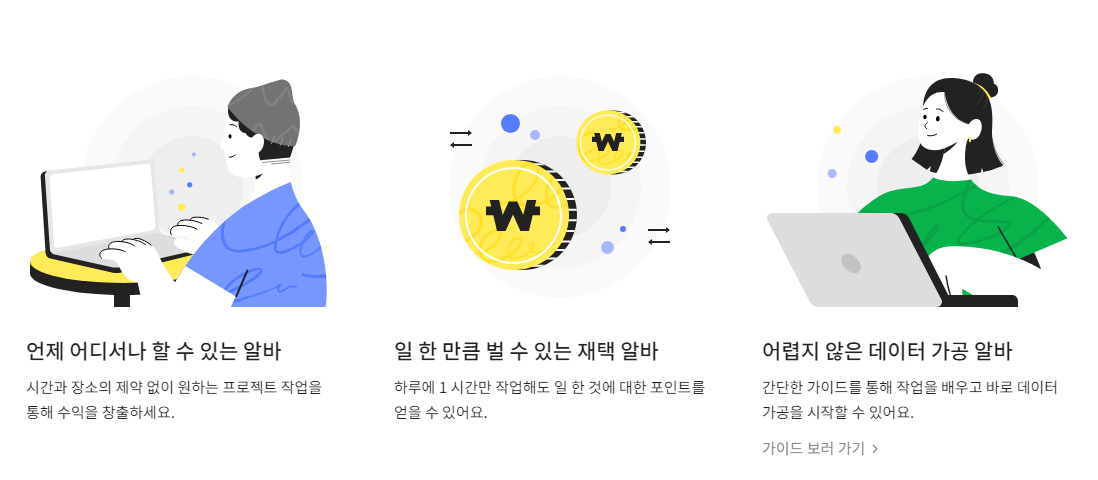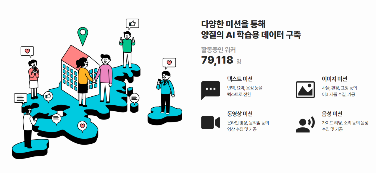 ‘인공지능 개발에 필요한 데이터’를 수집, 가공하면서 틈틈이, 원하실 때 돈을 벌 수 있는 서비스입니다.