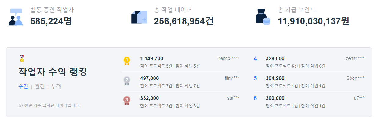 데이터 제공, 가공, 검수 등 다양한 작업을 통해 포인트를 얻을 수 있으며, 포인트는 현금으로 환전할 수 있습니다.